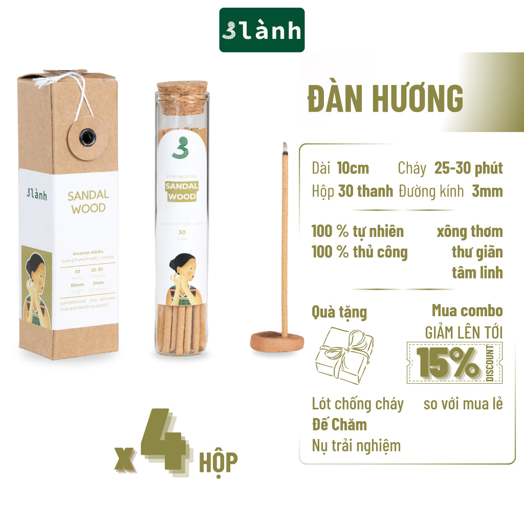 Nhang Thủ Công Đàn Hương 3 Lành Hộp 30 Que 100 % Tự Nhiên Tặng Kèm Đế Chăm Không Hóa Chất Xông Thơm